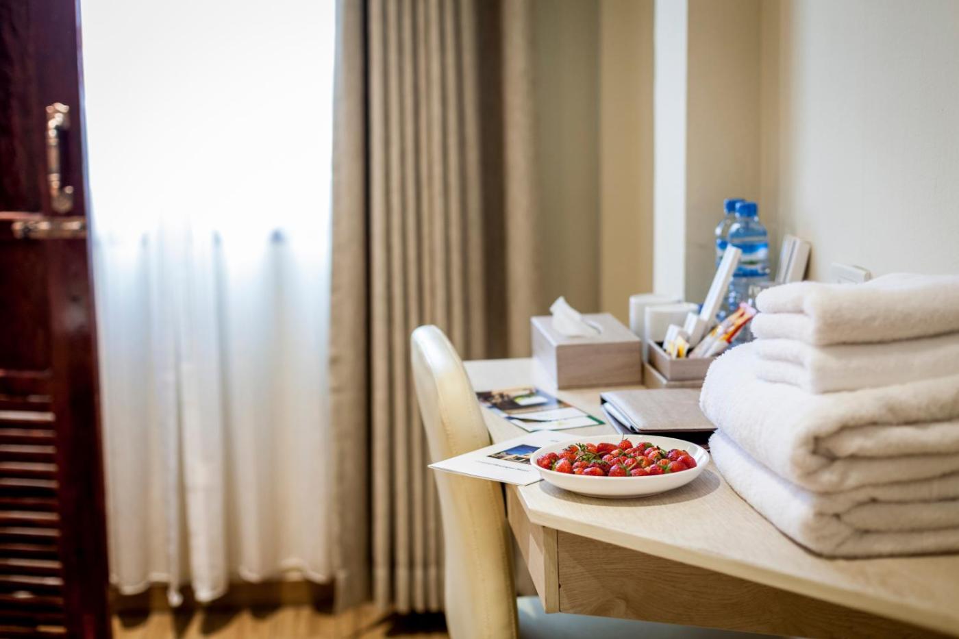 Deluxe Queen Room. Offering free toiletries and bathrobes, this double room includes a private bathroom with a walk-in shower, a hairdryer and slippers. The spacious air-conditioned double room offers a flat-screen TV with cable channels, a minibar, a tea and coffee maker, a seating area as well as city views. The unit offers 1 bed. ;